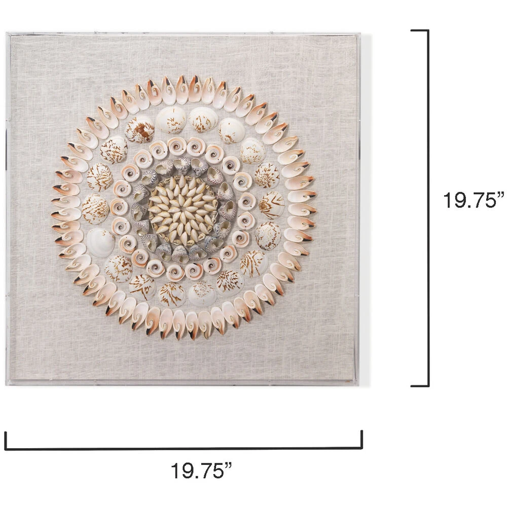 A revolving pattern of unique shell shapes create a circular pattern of organic beauty. Natural colors and textures of radiate outward while drawing you into this stunner from the sea. As if this wall art piece washed ashore, specifically for your wall.