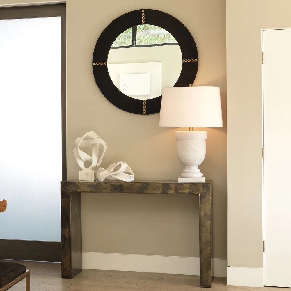 A rich metallic console with a simple linear design adds subtle glamour wherever it is placed. The Charlemagne Console Table is made from lightweight iron and features a swirling mineral patina that enhances its earthy alloy tones. The smooth surfaces reflect a subtle iridescence to elevate any room.