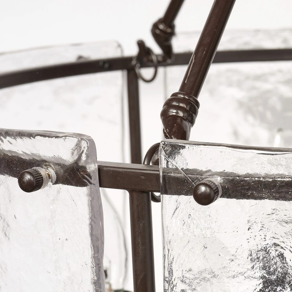 A refined study in contrasts, this striking chandelier features a softly curved slice of icelike glass that softens and diffuses the “flame” of the bulbs behind it. A smooth oil-rubbed bronze canopy and chain perfectly complement the richly textured glass. Sophisticated yet simple, this is a beautiful choice for a modern interior.