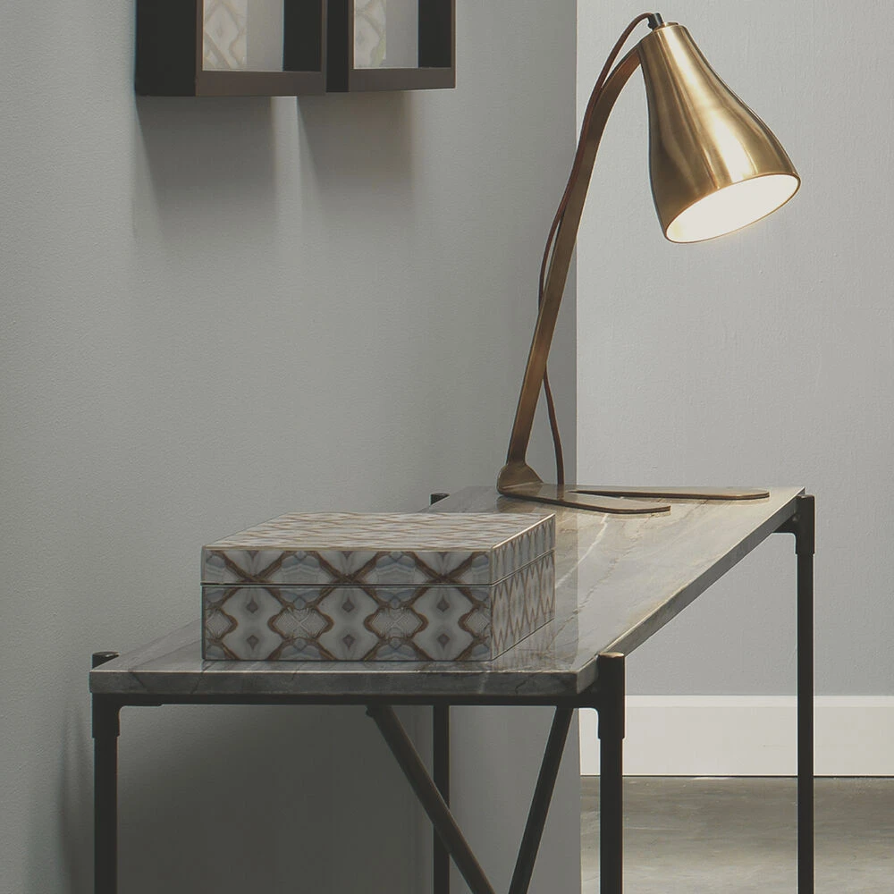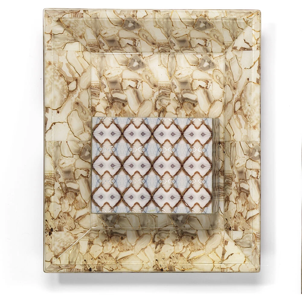 The design on this box is taken from photos of agate repeated in a way that gives the impression of looking through a kaleidoscope. The hand applied gold leafing adds another layer to create this incredible finish.