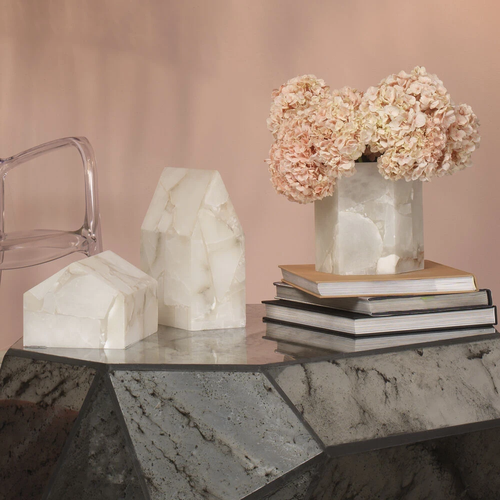 Inspired by the Monopoly game pieces we all know and love. Our Alabaster collection is unique in how we have combined organic cut pieces of alabaster to create a fresh approach to designing with this beautiful, natural material. Each piece is unique in the way it is puzzled together to make a flat surface. These decorative pieces are perfect for adding a touch of elegance to bathrooms, living rooms, entryways and bedrooms.