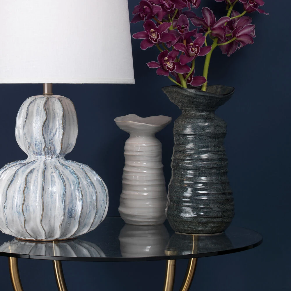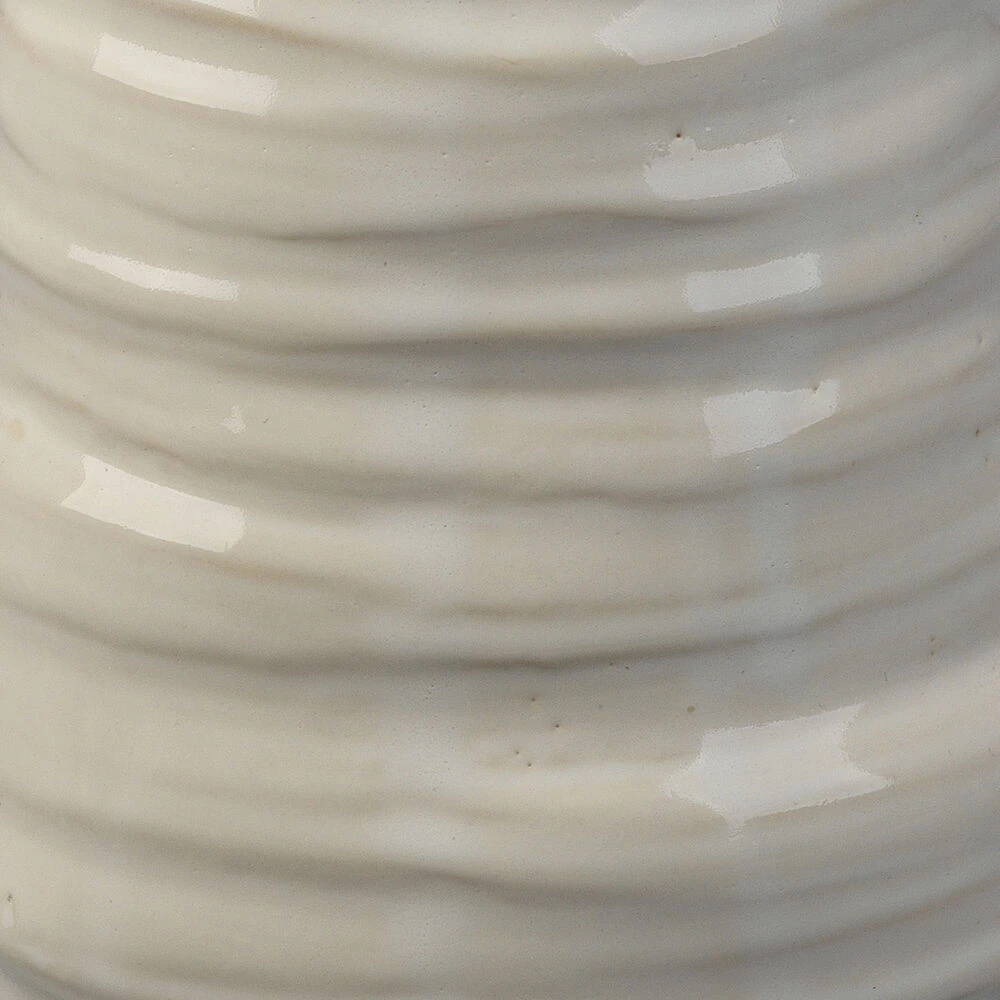 Resembling objects found on a seashore, this vase features a ribbed organic ceramic body and pearl cream glaze. Ideal for showcasing fresh garden cuttings or dried florals. Available in two sizes, easily mix and match for a layered, earthy look.