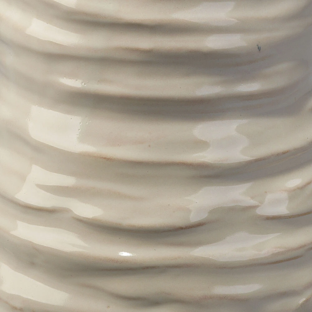 Resembling objects found on a seashore, this vase features a ribbed organic ceramic body and pearl cream glaze. Ideal for showcasing fresh garden cuttings or dried florals. Available in two sizes, easily mix and match for a layered, earthy look.